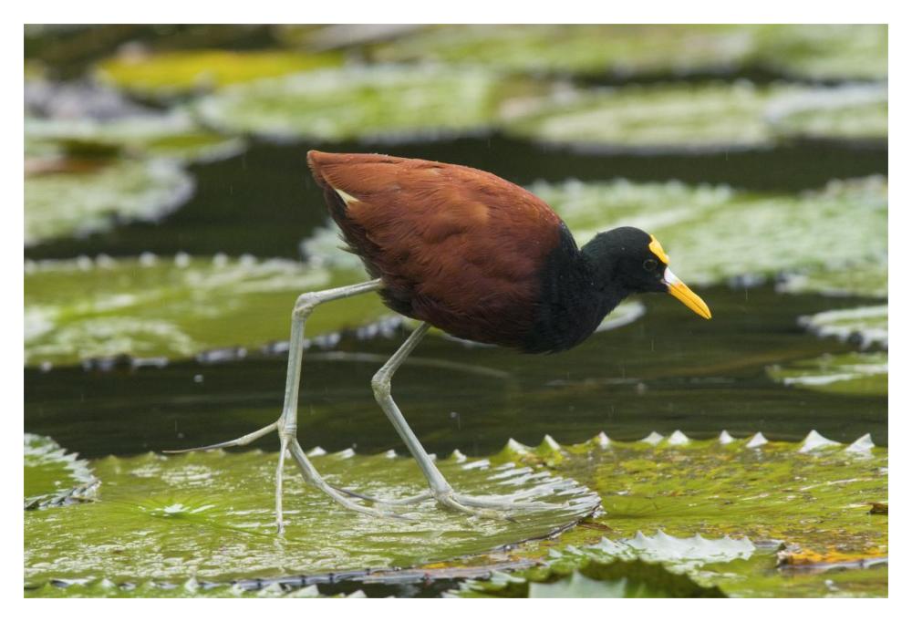 It is a paper art photograph featuring a Northern Jacana foraging on lily pads in Costa Rica.