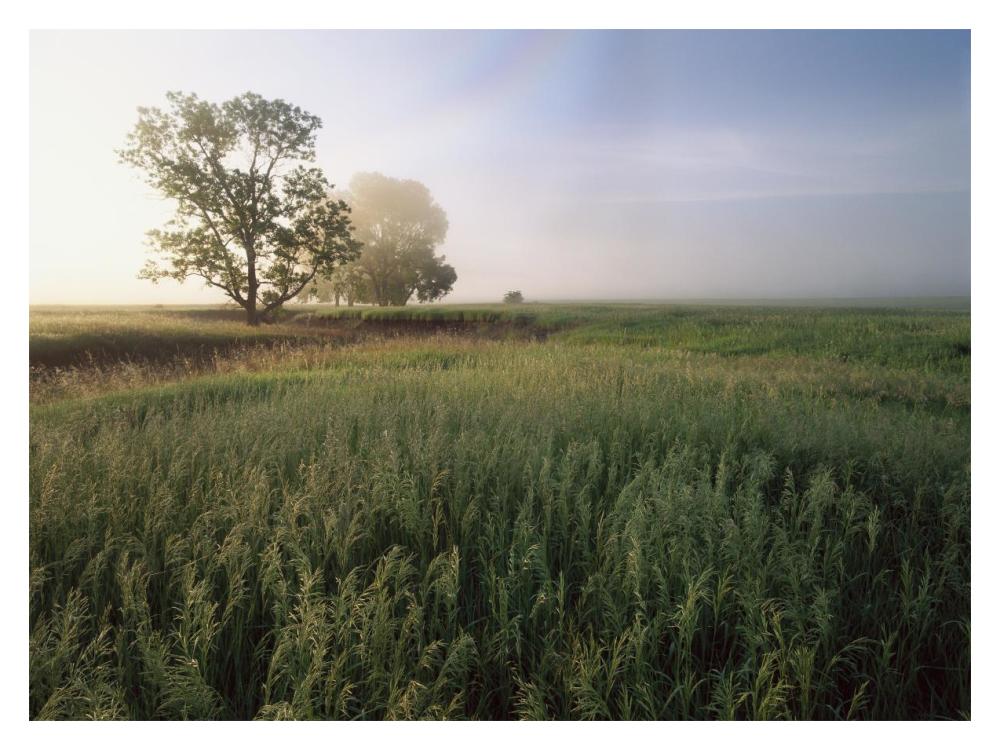 It features oak trees shrouded in fog with tallgrass prairie and invasive Great Brome grass.