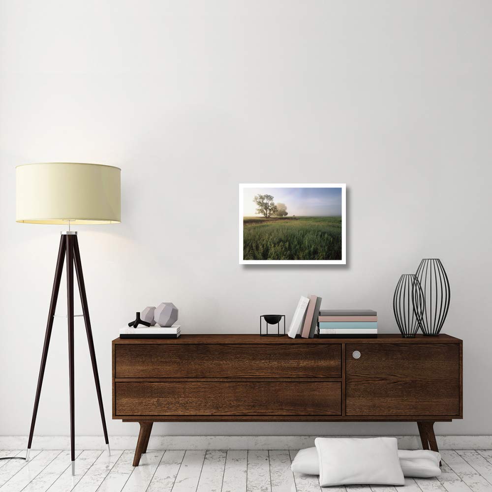 The print features a serene landscape of oak trees shrouded in fog, set in the tallgrass prairie of Flint Hills, Kansas.