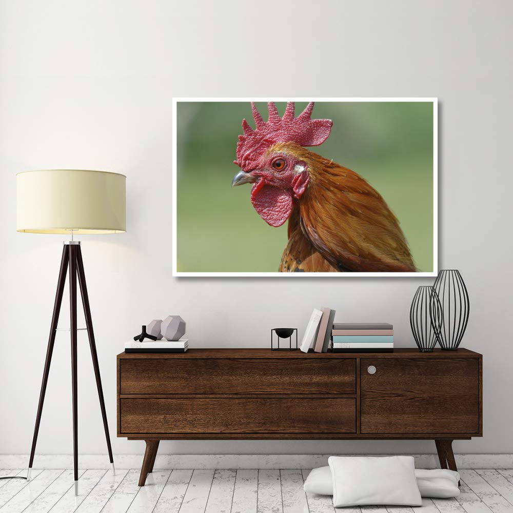 The Global Gallery Portrait of a cockerel measures 62 inches by 42 inches.