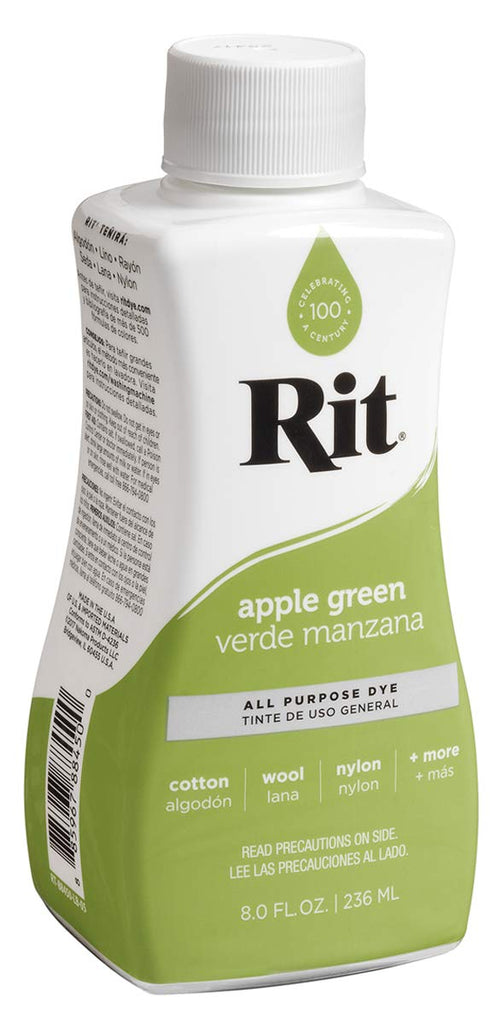 The Rit, Yard, Apple Green dye bottle contains eight ounces of liquid dye, perfect for various fabric projects.