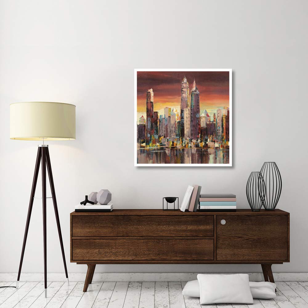 The artwork can be displayed in living rooms, offices, or any space that benefits from a vibrant cityscape theme.