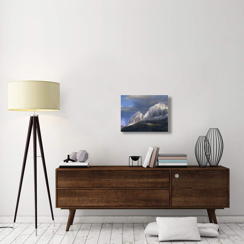 This canvas art features a scenic depiction of snow-dusted mountains in Glacier National Park, Montana.