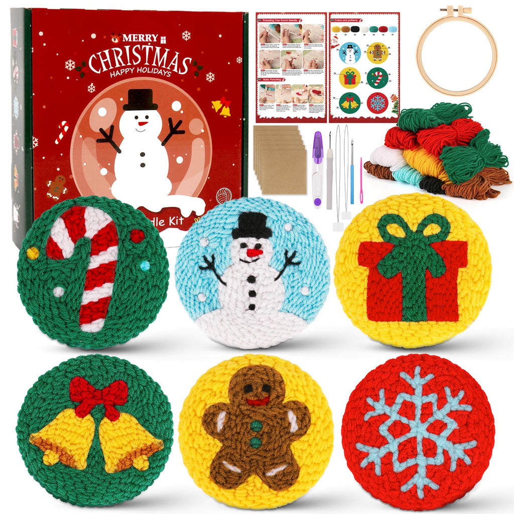 This 6PCS Christmas Punch Needle Kit is a beginner-friendly DIY embroidery set featuring six festive designs (Snowman, Gingerbread Man, Gift Box, Bell, Snowflake, Candy Cane). It includes all necessary materials-punch needle, yarn, hoop, felt pads, and instructions-to create handmade coasters, wall art, or ornaments. Suitable for holiday crafting, it offers a relaxing way to make charming Christmas decorations