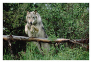 This artwork depicts a timber wolf leaping over a fallen log, capturing the essence of wildlife in North America.