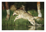 This artwork features a Timber Wolf running through a shallow river in Montana.