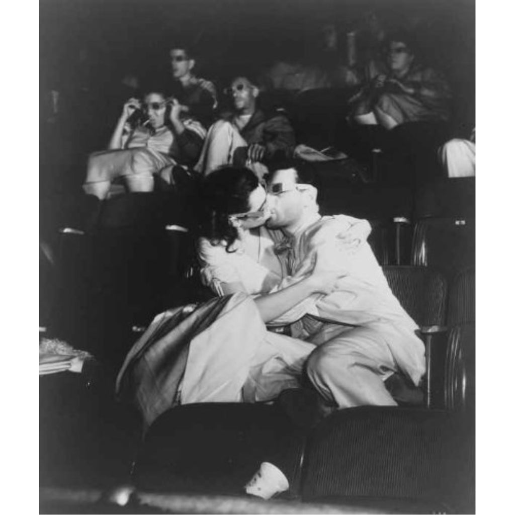 This photograph captures a moment from a 1945 movie theater, featuring a couple wearing 3-D glasses.