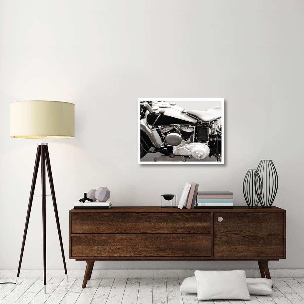 The artwork showcases a vintage motorcycle engine, appealing to enthusiasts of classic motorcycles and automotive art.