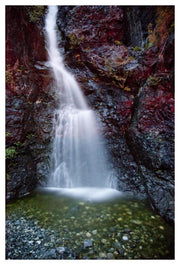 This artwork features a serene landscape scene of a waterfall in a creek along the Gold River Highway, Vancouver Island, Canada.