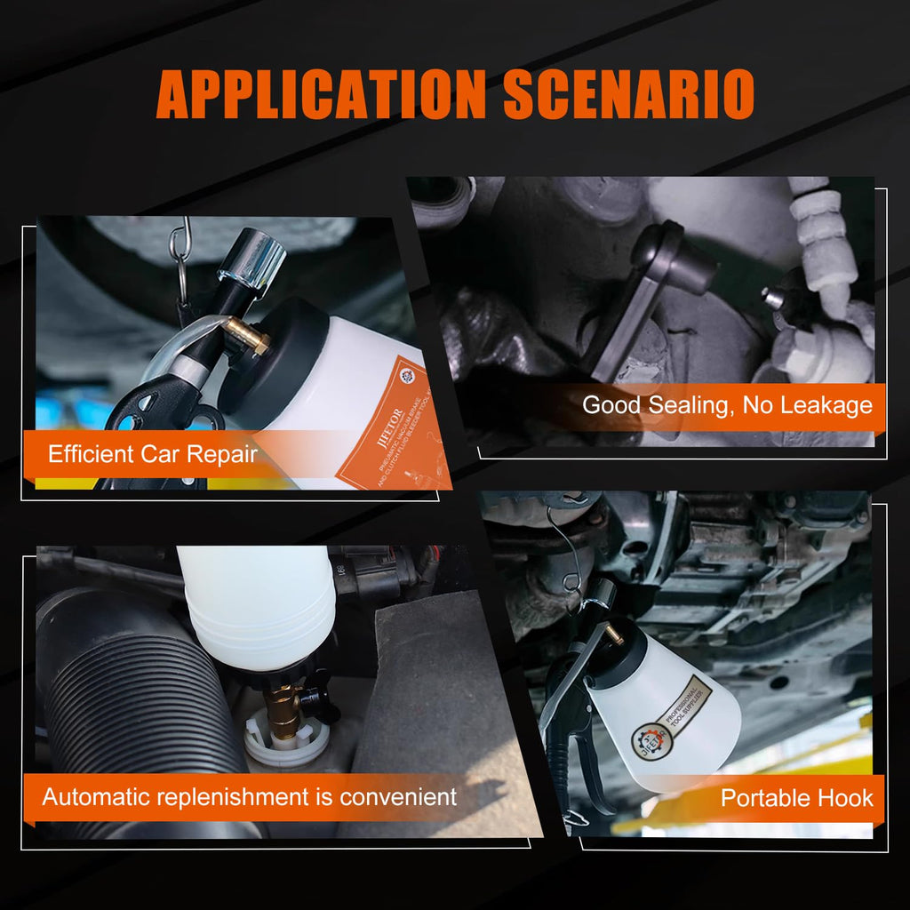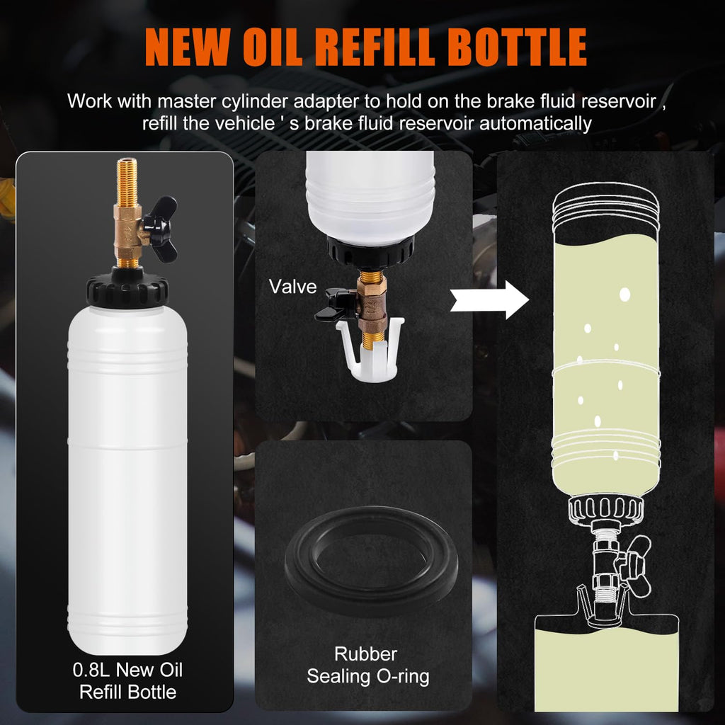 Packing List1x 1 Liter Old Oil Collection Bottle with 1.8 Meters Hose and Black Suction Nipple (Hose: inner diameter 5MM, outside diameter 9MM)1x 0.8 Liters New Oil Refill Bottle1x New Oil Refill Bottle Lid with Long Screw1x New Oil Refill Bottle Lid O-ring4x Master Cylinder Adapters2x Air Quick Plugs (American and European Style)1x Spare Black Suction Nipple1x Barbed Connector for Spare Black Suction Nipple1x InstructionSomething you need but not included:Air compressorAir compressor hose4 Master Cylinder Adapters1.25 -1.6 inch (32 to 41 millimetres)1.1 -1.45 inch (28 to 37 millimetres)0.95 -1.25 inch (24 to 32 millimetre)0.8 -1.2 inch (21 to 30 millimetres)Features1. Car brake fluid changer tool kit includes new oil refill device and waste oil extractor, 2 in 1 set2. One person operation design, easy to handle3. Widely suit for car truck motorcycle pickup and most vehicles4. Refill bottle can be held on the mouth of vehicle's brake fluid reservoir by the long screwNote1. Please wear gloves and goggles when use2. The vacuum brake bleeding kit should be used by professional or under the guidance of a professional3. Always refer to equipment manufacturer's operation instruction4. Please hold the bottle cap to open the bottle, not the trigger or anything else5. It is pneumatic tool only, can not use as a hand tool, you can search B085TGJJJF for manual tool6. If there is any leakage on the joint of the vehicle bleeder valve and black suction nipple, please try grease to seal it