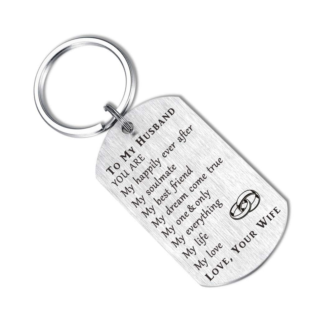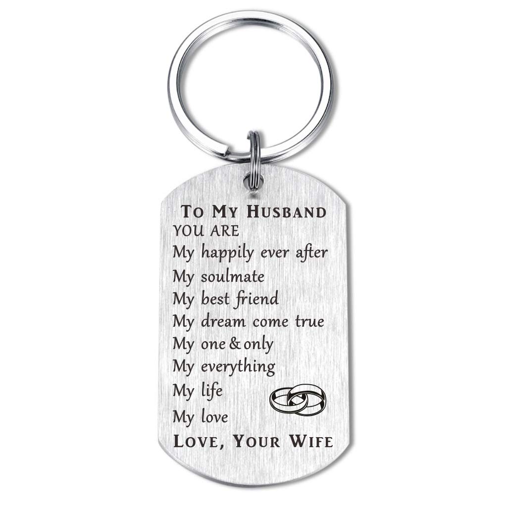 To My Husband from Wife for Soulmate Anniversary Valentine Wedding Keychain Gifts Birthday Christmas PresentTO MY HUSBAND, YOU ARE, my happily ever after, my soulmate, my best friend, my dream come true, my one & only, my everything, my life, my love.LOVE, YOUR WIFESpecial gifts for husband from wife on many occasions - birthday gifts, fathers day gifts, Christmas gifts, valentines, new year, hard times, wedding anniversary and so onMaterial - Stainless SteelNo Rust, No Allergy, No Fading, No DeformationCould be kept as meaningful gifts for whole lifeSize and Packagekeychain size is 2x1.1inches,Weight - 50gCome with a black velvet gift bag, ready for gift giving
