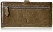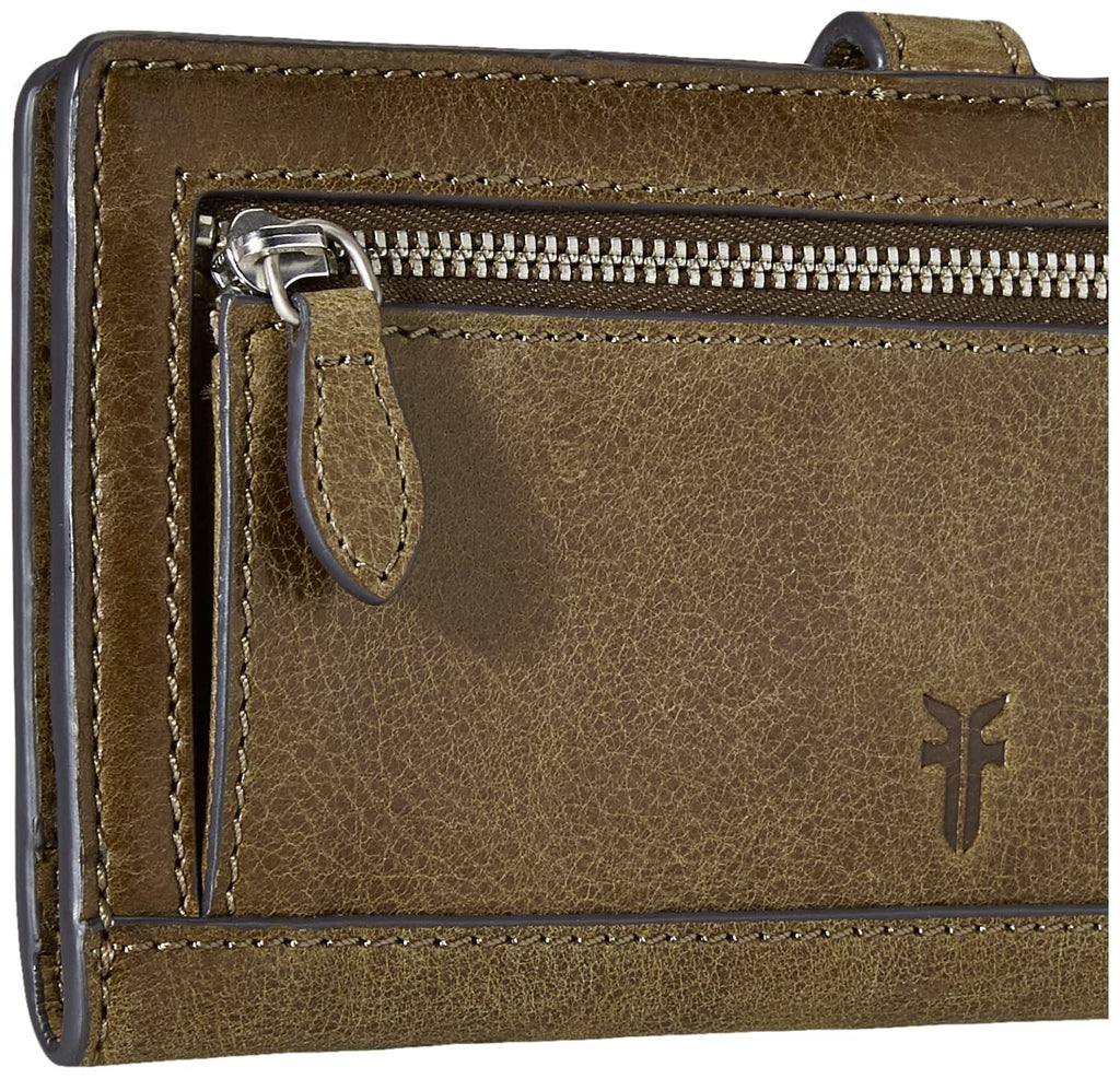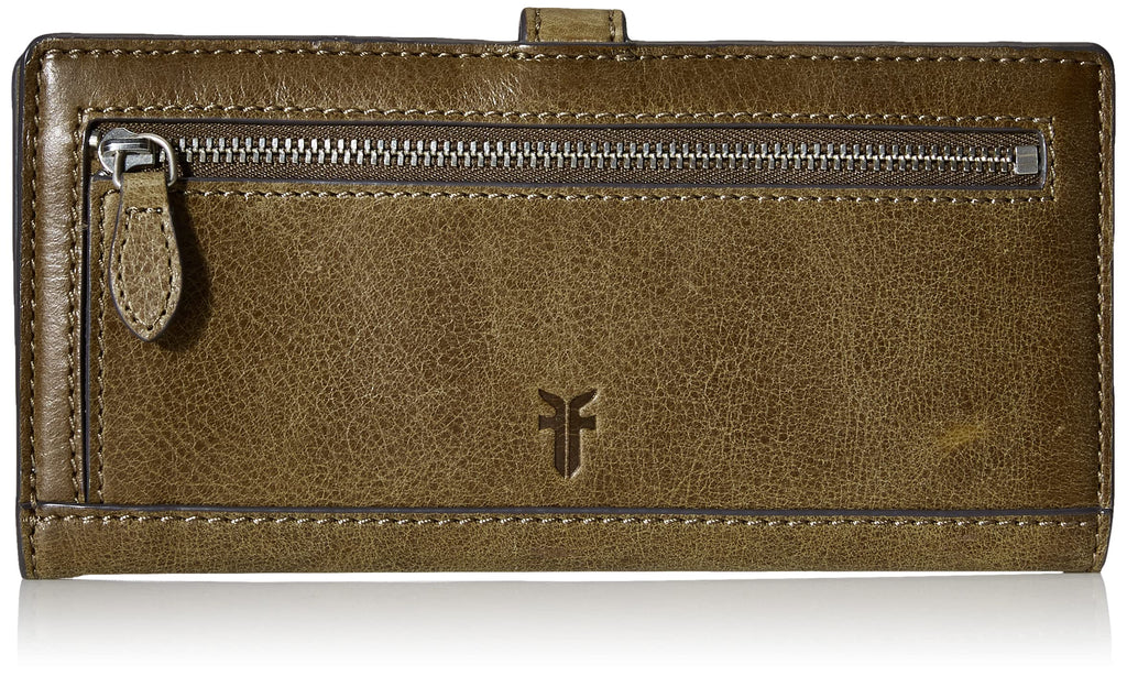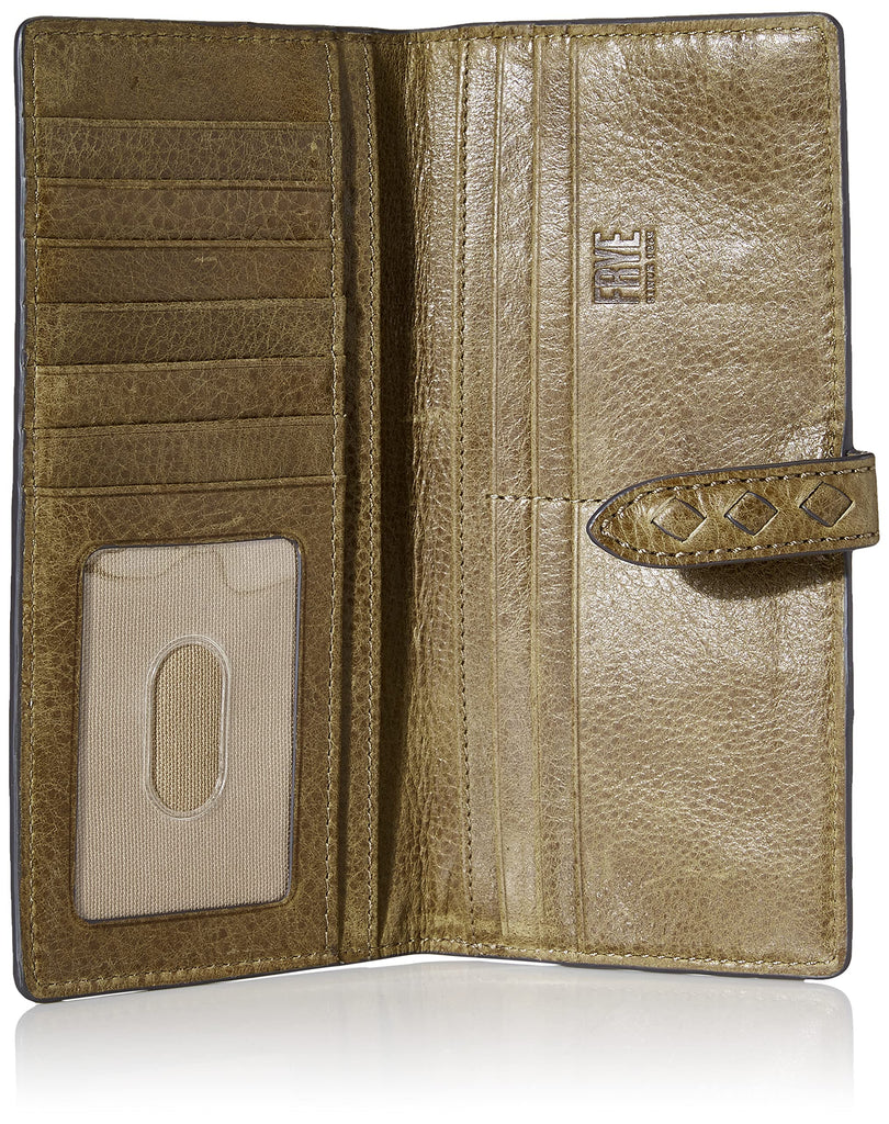 DescriptionThis continental pebbled leather slim snap wallet with interior and exterior pockets is part of Frye's Reed collection. Antique metal hardware with a snap closure. Has 12 card slots, clear ID thumb window, 3 slip pockets, 1 zip pocket. Measurements: 3.75H X 7.75W.