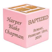 This personalized wooden baby block is the perfect keepsake gift for a baptism! Made from solid maple wood, it is professionally laser engraved on all sides, and is available in 2, 2 1/2, and 3 sizes. Top: Letter Side 1: Full name Side 2: Day and date (Baptized will be engraved above the date by default. If you would like something different, add it to the Day and Date text box while entering your personalized information) Side 3: Church name, city, and state Side 4: Cross image Bottom: Custom verse or message Font sizes may be adjusted slightly for proper formatting, but will be similar to what is shown in the photos. Block comes wrapped in pink tissue paper.
