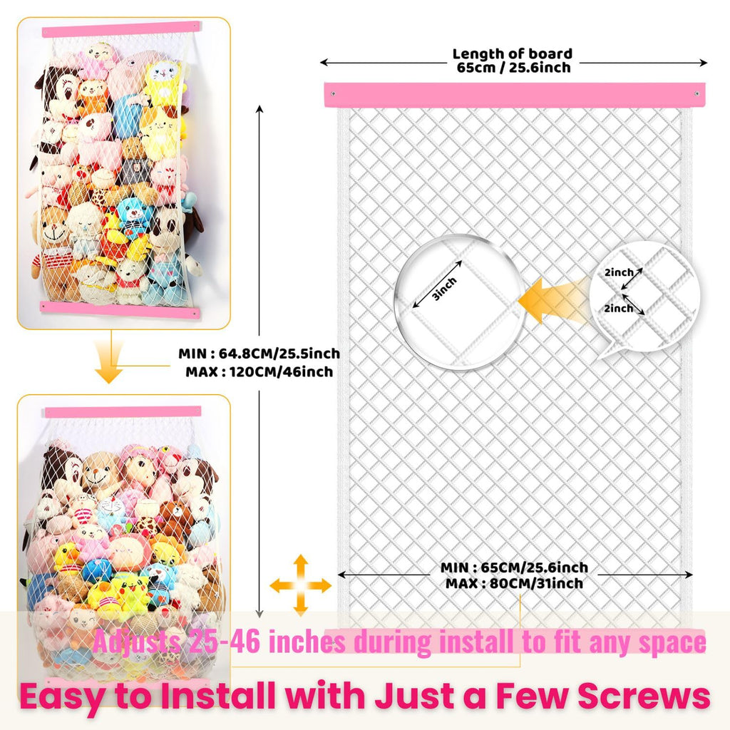 Maximize Your Space: Revolutionize your child's room with our unique stuffed animal storage hammock. Made from high-elasticity polyester net, it can hold an impressive number of stuffed animals, transforming clutter into order and maximizing space in any room. Stylish and One-of-a-Kind Design: Unlike any other, this stuffed animal hammock combines functionality with style. Its charming design and durable construction add a unique touch to your home decor, making it both a practical and decorative piece. Ideal for Display: Display your child? cherished stuffed animals in our toy hammock for stuffed animals. Perfect for living rooms, bedrooms, or children's rooms, it? a beloved feature that kids and parents will adore. Eco-Friendly and Long-Lasting: Crafted from sustainable pine wood and highly durable polyester, our stuffed animal holder is built to last. It's the ideal solution for innovative stuff animal storage ideas, ensuring safe and eco-friendly storage. Effortless Installation: Our stuffed animal organizer is designed for easy setup, with a detailed manual to guide you. Whether mounting on walls or wooden doors, this plushie net makes organizing stuffed animals simple and enjoyable.