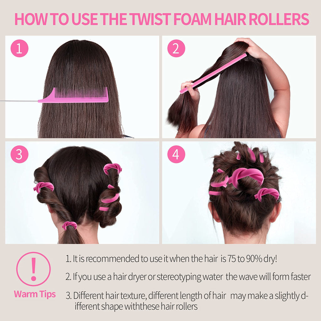 How to Use Your Hair Curlers Rollers: 1.Spray some water on the section of hair, use the rat tail comb to separate a small section of slightly damp hair. 2. Start from the tips of the hair and wrap the section of hair you want to curl around the flexi rod several times, then roll the flexi rod up towards the scalp. 3. Bend the ends of the flexi rod to hold the hair in place. 4. Repeat steps 1 through 3 to complete curling your whole head. After 2 hours, release the flexi rods and let your curls unfurl! Flexible Rods Hair Curlers Set Features: 1.Soft and Flexible: Each curling rods is very soft, you can change the shape and curvature according to your needs, and make your own curly hair style. 2.Easy To Take and Store: Our hair rods is lightweight, which is very convenient for storage and travel. Soft foam curling sticks can be reused, wash with water, wait for drying, and then put it back in the bag. 3.Sufficient quantity, you can fully use or share it with your family and friends. Note: 1. It will get better results when the hair is slightly damp. 2.Adjust the direction of starting rolling hair can create various hair wave. 3. Pointed part included, please keep away from kids. 4. Manual measurement, please allow little size errors. Specification: Length: 24cm/9.5inch Diameter: 0.9cm/0.35in Material: soft foam, flexible iron, steel Package Include: 30 x Flexible curling rods; 1 x Rat tail comb leave magic night headband waver non over perming pillow rag rubber silk soft winding spongy straw tension twisty