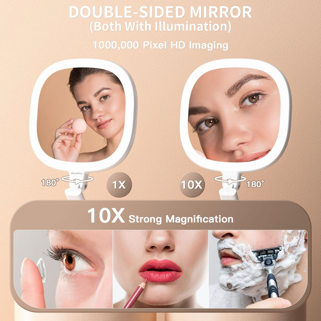 Beautifive Makeup Mirror with Light and Magnification, 10X/1X Light Up Makeup Mirror Travel Lighted Make Up Mirror with Adjustable Height Double Sides Folding Magnifying Mirror with Light