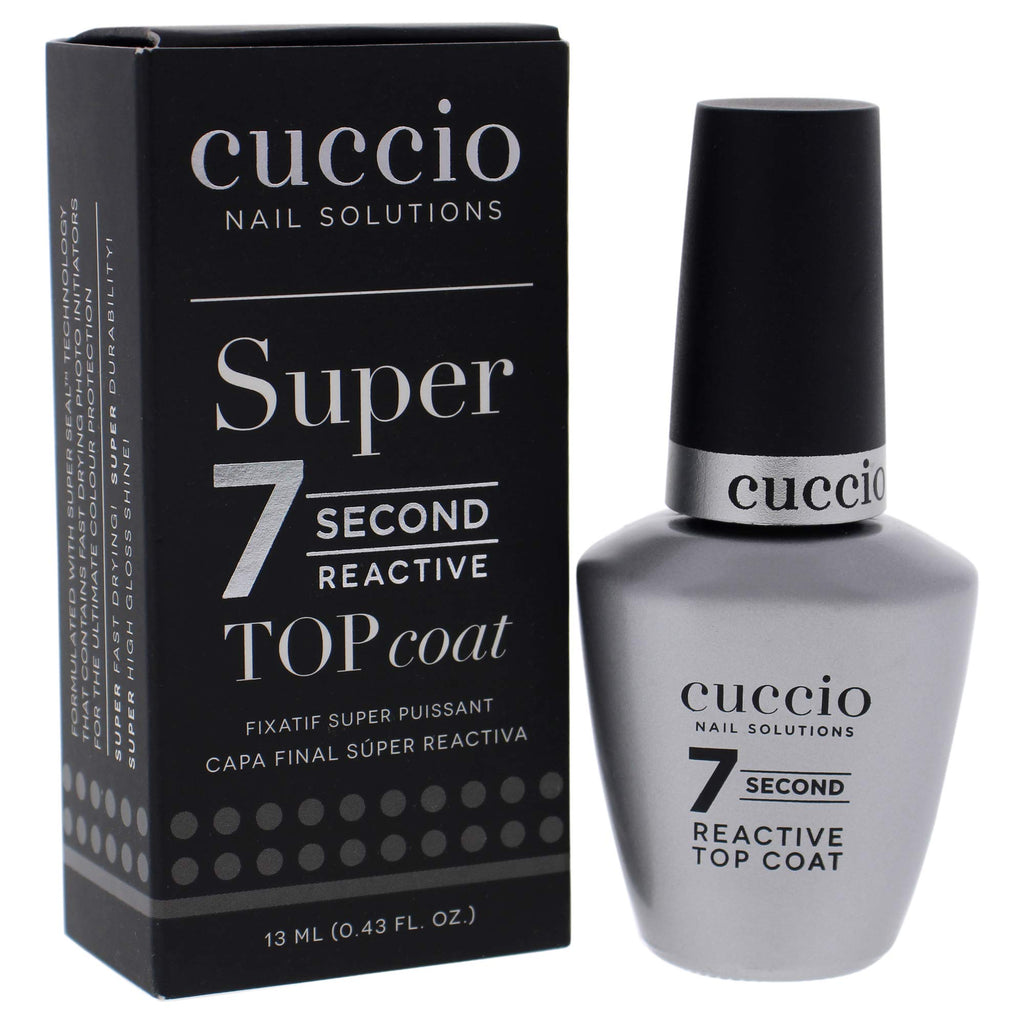The Cuccio Nail Solutions Professional Super 7 Second Reactive Top Coat is a super quick drying formula that is redefining the way in which you protect your nail colour. It creates a high gloss finish with incredible long lasting durability. It contains photo initiators and fast acting monomers that react with natural light to set-up super fast. Super 7 seals in colour by creating a coating that is second to none.