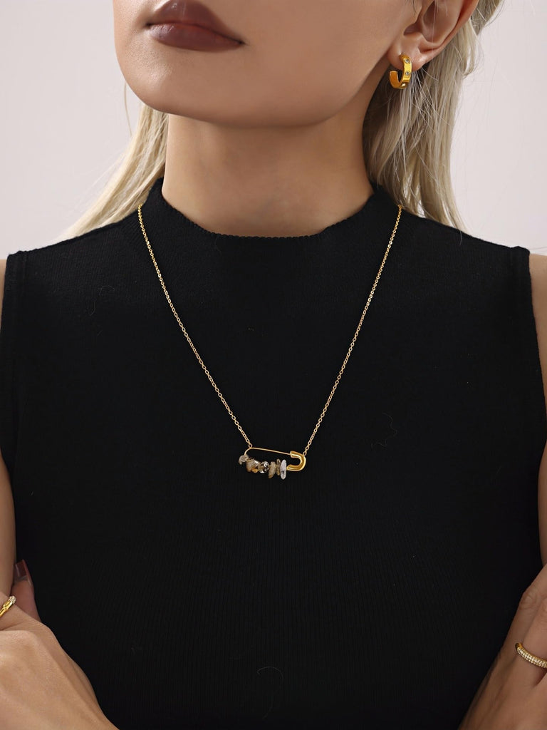 Edgy, elegant, and full of energythis gold safety pin necklace collection blends raw crystals and classic pearls with bold design. Each necklace features a unique natural elementamethyst stone, freshwater pearl, or citrine chipson a gleaming gold-tone stainless steel chain. Whether you're drawn to the calming energy of amethyst, the timeless elegance of pearl, or the sunny glow of citrine, this necklace is a lightweight, adjustable piece perfect for self-expression or gifting.
