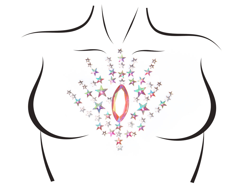The Leg Avenue Juniper Adhesive Body Jewels are multicolored, featuring a vibrant cluster of iridescent pink gems and stars.