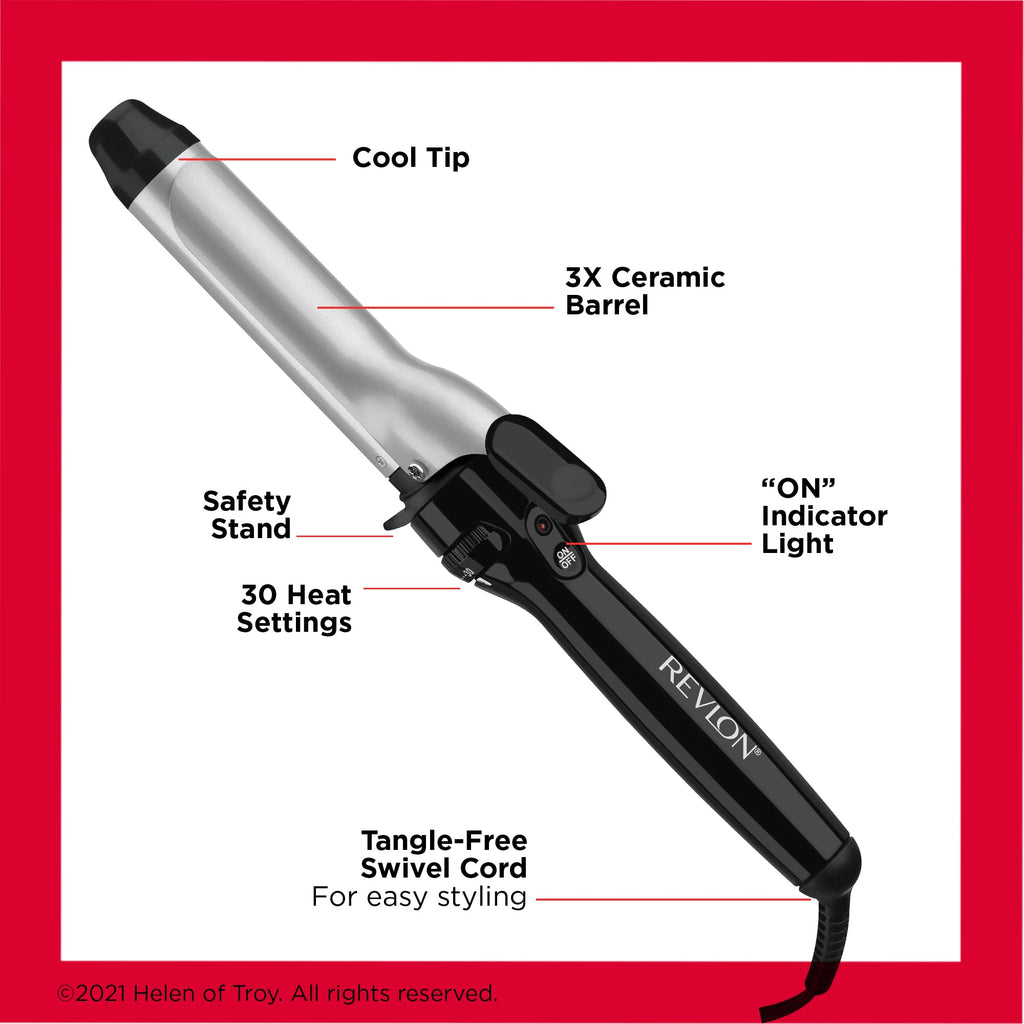 The Revlon Perfect Heat Curling Iron features a 1-1/4 inch barrel size, making it ideal for creating silky smooth tousled curls.
