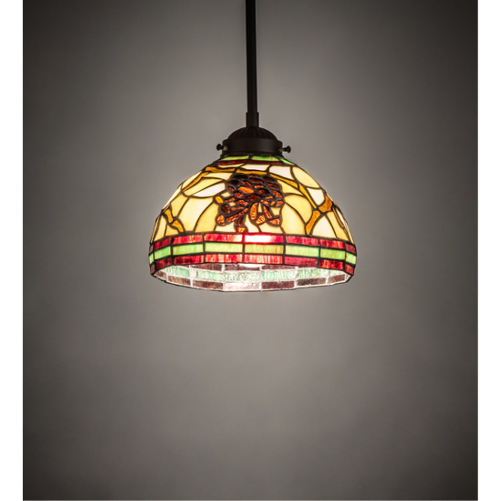 The pendant light is made of glass, featuring a unique woodland art glass shade crafted using the Meyda Tiffany copperfoil construction process.