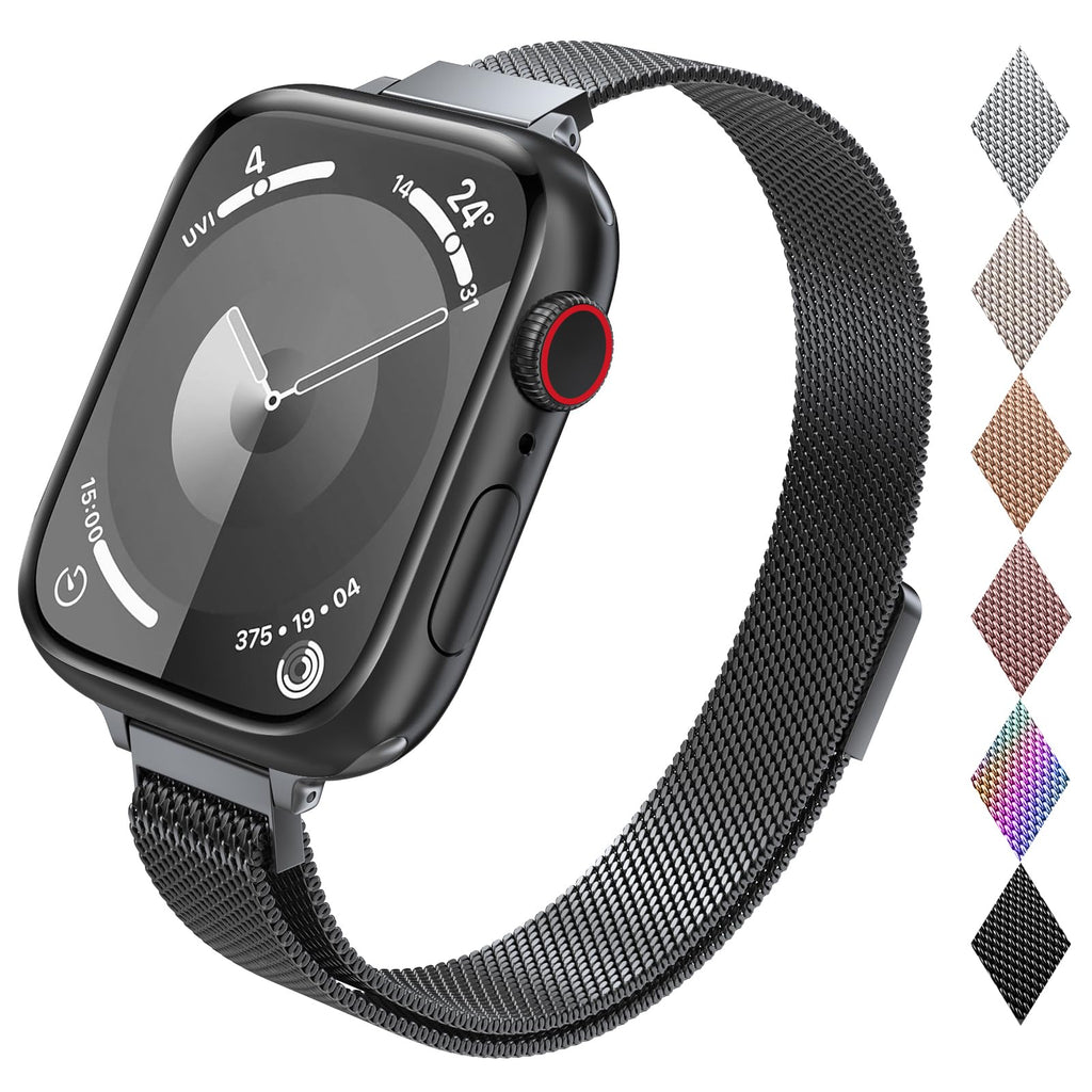 DMORI Compatible with Apple Watch Band Series SE 7 6 5 4 3 2 1 45mm 41mm 44mm 40mm 42mm 38mm, Stainless Steel Slim & Thin Mesh Magnetic Clasp Strap Women and Girl Replacement Band for iWatch ???2021 Newest Design!?: Our metal bands for Apple Watch made of high-quality stainless steel with a fine polish for a luxurious look.It is formed over our proprietary in house CAD designed and crafted stainless steel molds.Magnetic connector and loop design makes your strap more flexible to adjust the length. ???Compatible Models?: DMORI stainless steel mesh loop iWatch bands compatible with Apple Watch 38mm 40mm 41mm 42mm 44mm 45mm Series 7 Series 6, Series 5, Series 4, Series 3, Series 2, Series 1, SE.Suitable for for all stylish men & women. NOTE:38/40/41MM suitable for wrist size 5.5-8.5,42/44/45MM suitable for wrist size 5.7-8.9,please mearsure your wrist before ordering. ???Premium Material?: DMORI iWatch bands for women men made of high quality woven stainless steel metal with a unique magnetic lock and polished edge,breathable, durable, and comfortable to wear. The magnetic clasp makes it easy to install and remove the watch by hand without the need for tools! ???Breathable & Comfortable?: Our bands for apple watch 38mm 40mm 42mm 44mm is breathable, durable, lightweight and comfortable universal iWatch band. It is non irritating, which can prevent skin from irritation rash, the stylish stainless steel mesh buckle band is suitable for any occasion, anti-slip & sweat-absorbent,and the unique and excellent strap can enhance your personal charm,easy to install or remove. ???24H-Online Service?: Any problem with our metal bands, please contact us at the first time,we are glad to service for you within 24h. and provide 1-year warranty :free replacement or refund.