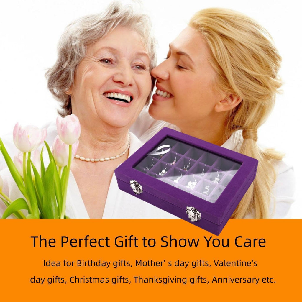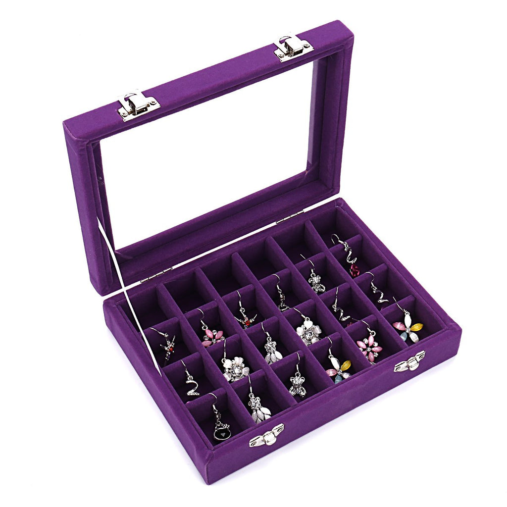 Ivosmart 24 Section Velvet Glass Jewelry Ring Display Organiser Box Tray Holder Earrings Storage Case (Purple)