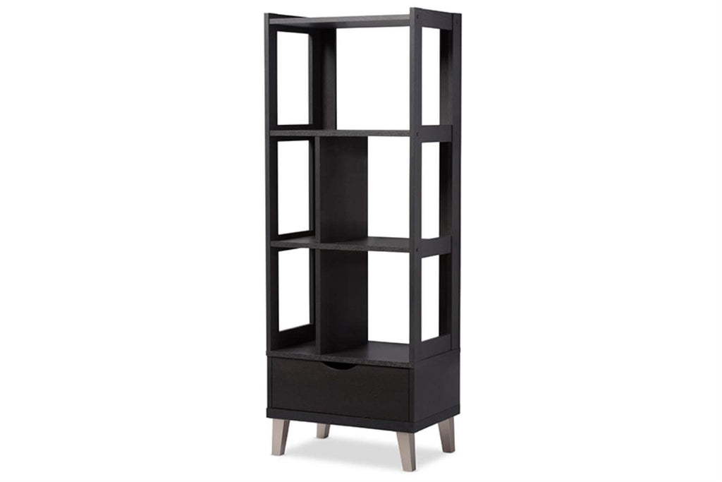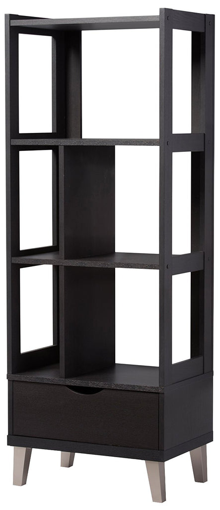 Simple And Architectural, The Kalien Dark Brown Wood Leaning Bookcase Is Reminiscent Of Modern And Contemporary Design The Kaliena S Clean And Functional Design Features Powder Coated Vinyl Legs Supporting The Framework Of The Bookshelf A Generous Sized Storage Drawer, Two Smaller Open Shelves, Two Larger Open Shelves And One Large Horizontal Spanned Shelf Are Built In Providing Storage Solution For A Better Living Crisp, Clean Lines And Finger Grooves Drawer Give The Shelf An Effortless Character And Charm The Bookshelf, Constructed Of Engineered Wood And Finished In Dark Brown Finishing Will Match With Your Modern Interior Decor The Kalien, Could Be Placed In Your Living Room Or Home Office, Provides Ample Storage Space For Your Display Items, Books, Pictures And Accessories Made In Malaysia, The Study Desk Requires Assembly