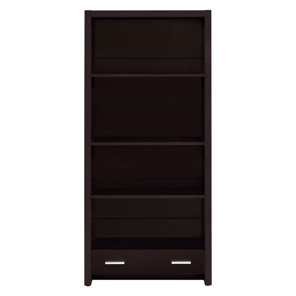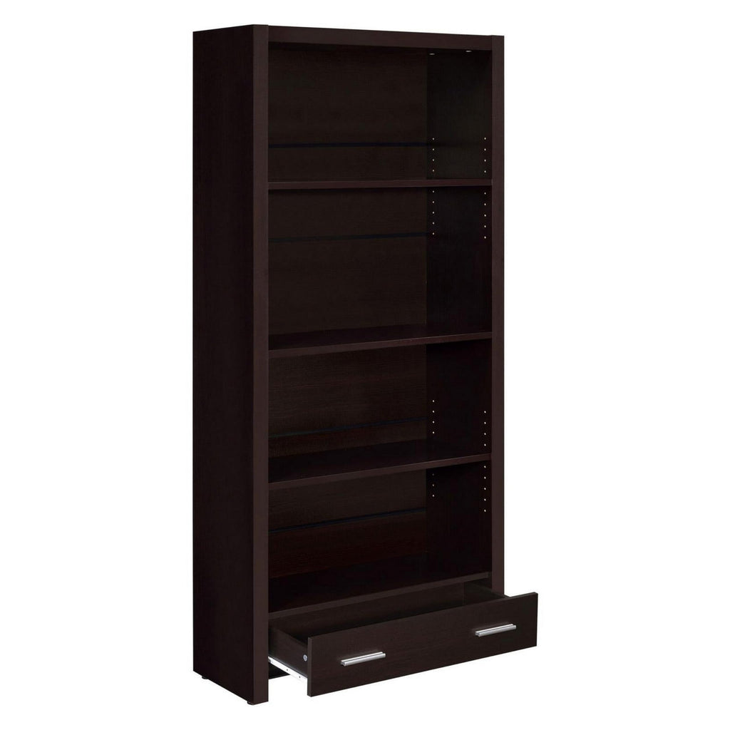 The bookcase is finished in a dark brown color, which adds an elegant touch to various home decors.