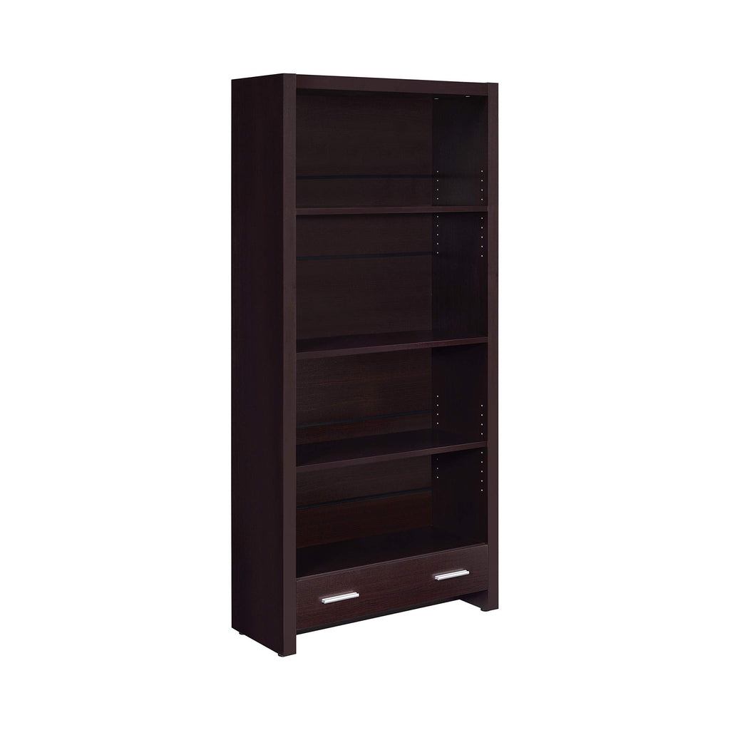 The bookcase features a transitional style, blending traditional and contemporary design elements.