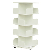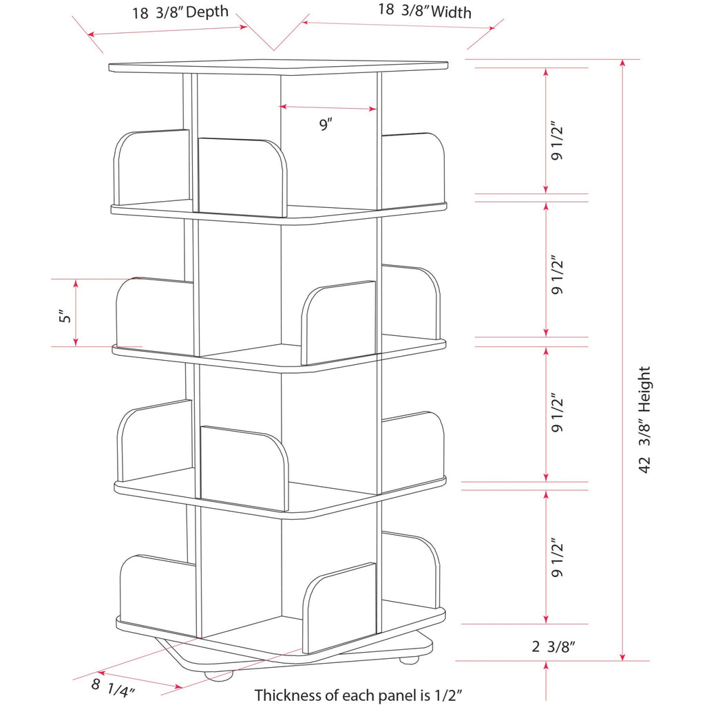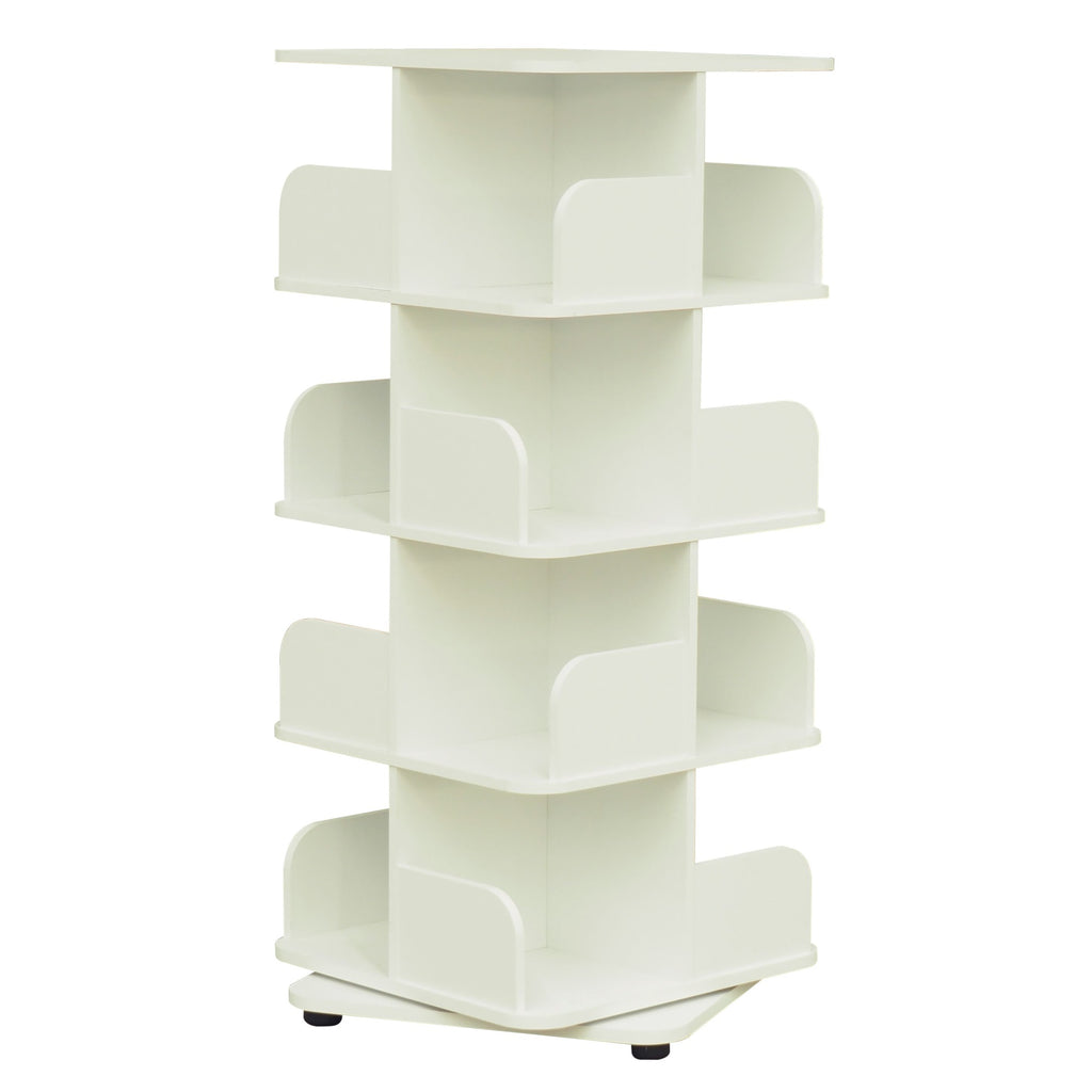 Hartwick 4 Tier Revolving Bookcase Tower Display Unit With 16 Shelves, White Wood, Contemporary. This Clean-Lined Hartwick Revolving Bookcase Rotates A Full 360 In Either Direction, Allowing For Easy Access. The Unique Design Provides A Practical Storage Solution For Any Space And Helps You Maximize Storage Space. Blending With Any Decor, This Hartwick Revolving Bookcase Is Suitable For Any Style Of The Room, And The Minimalist Style Will Perfectly Match Any Room In Your Home Or Office.Key Features:Finish: Whitematerials: Laminated Woodmetal Revolving Mechanismoverall Weight: 54 Lbsoverall Dimensions: 18W X 18D X 42Hshelves Storage Size: 8W X 9D X 9.5Hshelf Stopper Panels Height: 5Panel Thickness: 1/2 Inchassembly Required