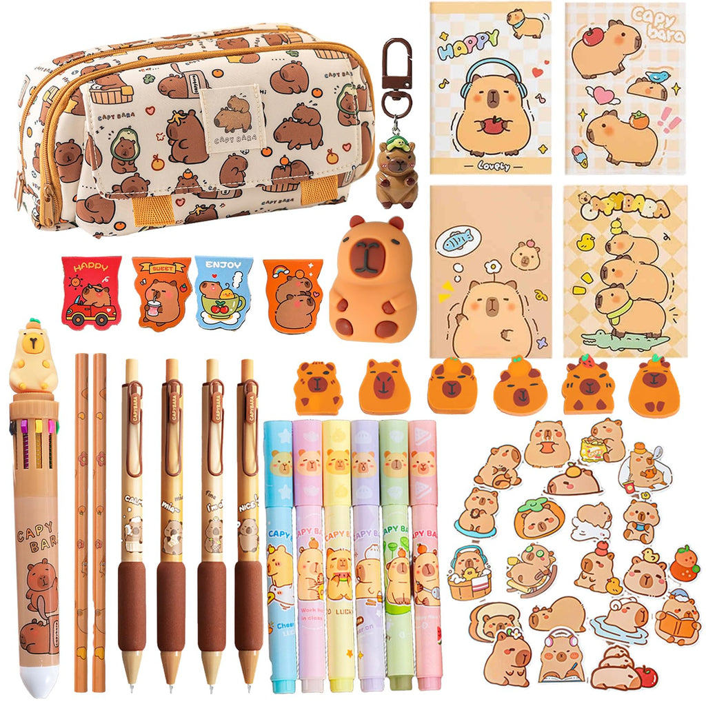 Bring a touch of whimsy to your stationery collection with this delightful Capybara-themed pencil case gift set. The spacious main case features an adorable all-over print of charming capybaras in various poses, complete with 3 practical compartments to keep your supplies organized. This comprehensive set includes everything you need: ballpoint pens with cute capybara designs, colorful markers, decorative stickers, a keychain, and Mini notebook. The cases wide-opening design allows easy access to all your items, while the durable canvas construction ensures lasting use. The carefully curated collection combines functionality with adorable aesthetics - from the pastel-colored pens to the charming capybara-themed accessories. Perfect for students, artists, or anyone who appreciates cute stationery, this set makes organization fun and stylish. The included stickers and decorative elements let you personalize your supplies while keeping them neatly contained in the roomy, multi-compartment case.