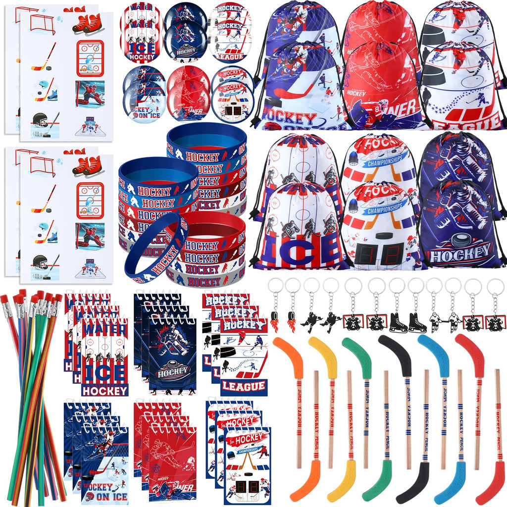 Features: This set of party supplies is carefully designed, which can easily attract attention from little boys and girls, becoming a big hit among them at the party, as well as boosting the atmosphere. Specifications: Color: as shown in pictures Size: as shown in pictures Package includes: 12 x Hockey drawstring bags 12 x Hockey silicone bracelets 12 x Hockey badge buttons 12 x Hockey keychains 12 x Hockey pencils 24 x Hockey bookmark 18 x Hockey notepads 1 Pack of stickers (50 pieces) Notes: Manual measurement, please allow slight errors on size. The color may exist a slight difference due to different screen displays. Small and pointed items contained, please keep away from little kids.