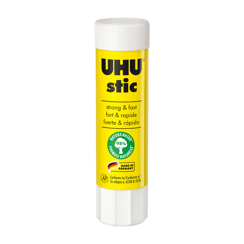 The Uhu Glue Stick is primarily made of non-toxic materials and conforms to ASTM D-4236 standards. It is ideal for bonding paper, cardboard, and photos.
