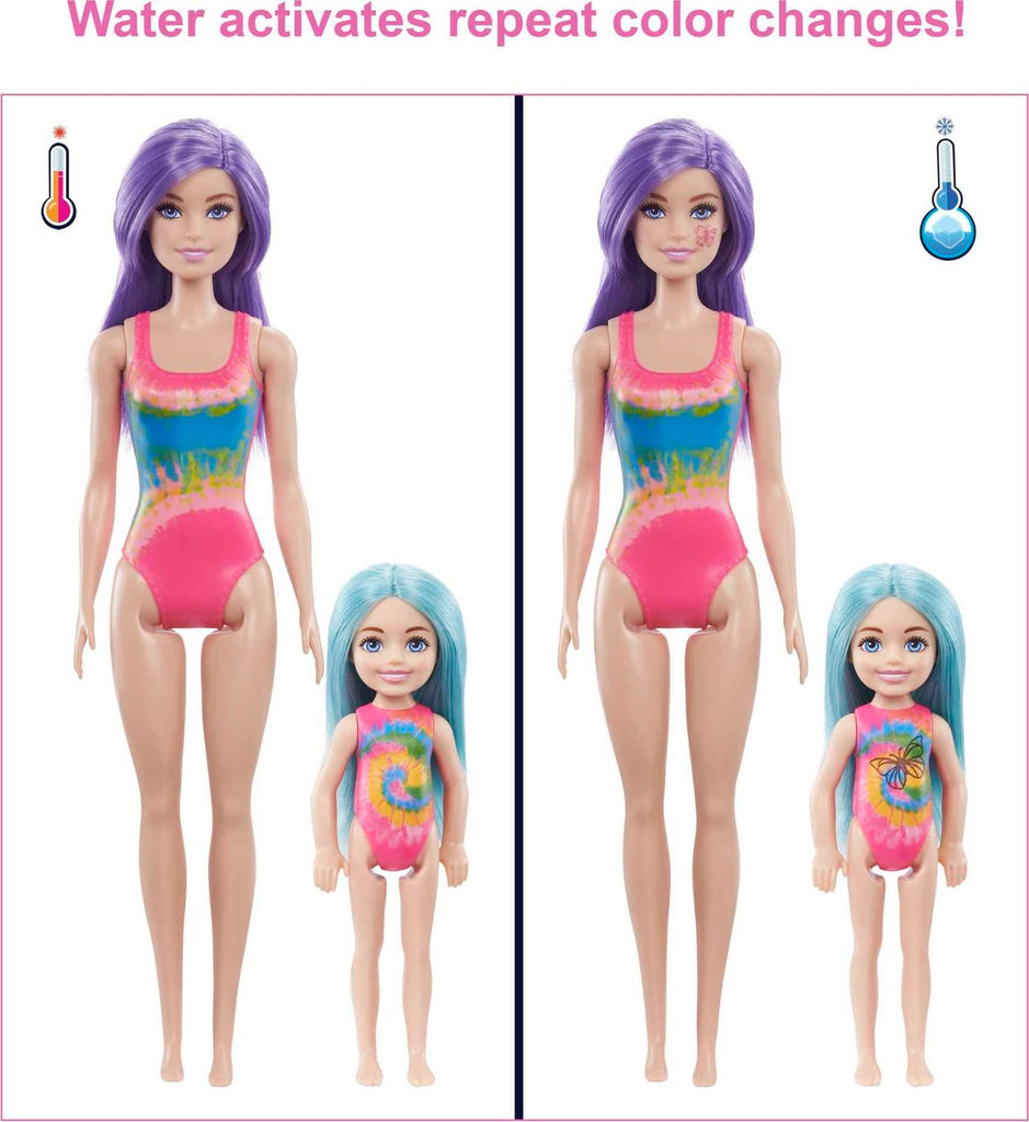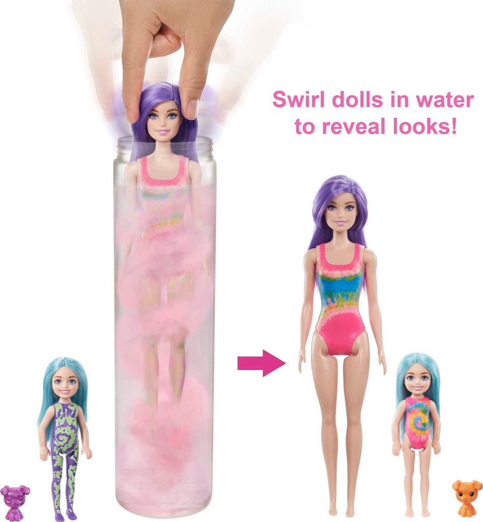 Barbie Color Reveal Tie-Dye Fashion Maker Gift Set Creates The Ultimate Unboxing Experience With 50 Surprises! Unbox To Find A Color Reveal Barbie And Chelsea Doll In A Color Reveal Neon Tie-Dye Coating, A Magic Fashion Reveal Tablet That Consists Of White Clothing To Dye, A Complete Tie-Dye Toolkit That Easily Allows Kids To Create Their Own Fashion Looks For Barbie And Chelsea Dolls And 35+ Fashion-Studio Themed Pieces. Additional Surprises Include A Color Reveal Puppy, Color-Change Activations And A Scrunchie For Kids To Tie-Dye And Wear. Reveal And Repeat -- The Neon Paint Included In The Kit Is Washable So Kids Can Create Tie-Dye Fashions Again And Again! Kids Can Style Barbie And Chelsea Dolls With Their Very Own Fashion Designs And Add Accessories To Complete The Totally Tie-Dye Looks. Dolls Cannot Stand Alone. Colors And Decorations May Vary.