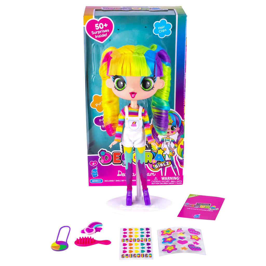 Decora Fashion Girlz 11Dolls have eye-popping colors and incredible style. Completely poseable and customizable, they come with clothes, accessories, and wear-and-share stickers that make each doll totally unique and a bold celebration of creativity. Adorable Sticker Sheets, Fabric Outfit, Trendy Shoes, Cute Accessories, Wear & Share Hair Clips, Collectible Charm Signature Comb, Doll stand included