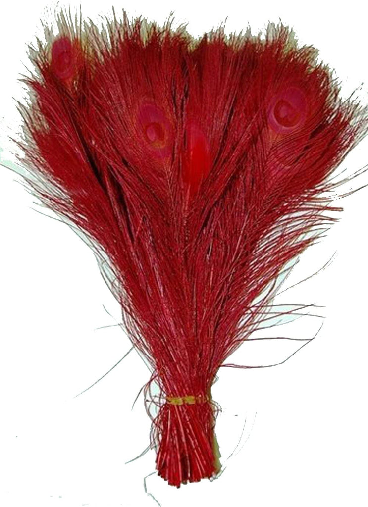 The peacock feathers are dyed red. This vibrant color adds a striking touch to any decoration.