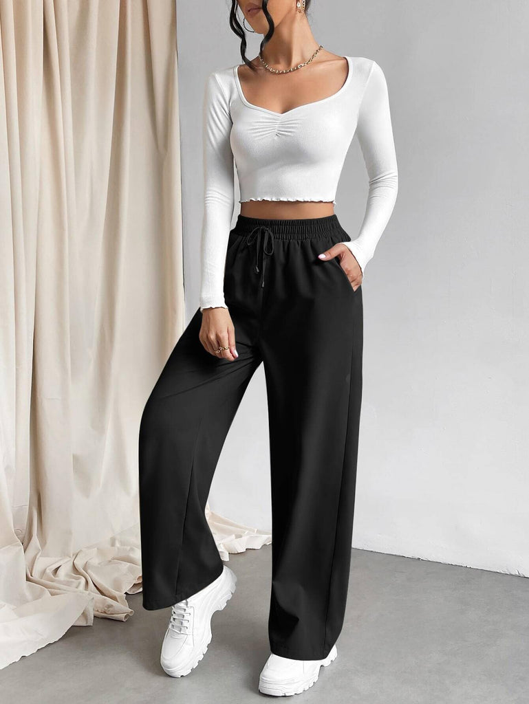 The Leriya Fashion LF-TR973 Women's Trousers have a solid pattern with a high waist design and wide leg style, making them both fashionable and comfortable.