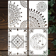 The pack includes four giant mandala stencils. Each stencil features intricate designs suitable for multiple artistic applications.