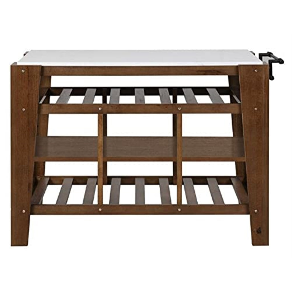 The rustic brown wooden frame and clean lines of the kitchen island complement various decor styles, including modern, farmhouse, and minimalist.