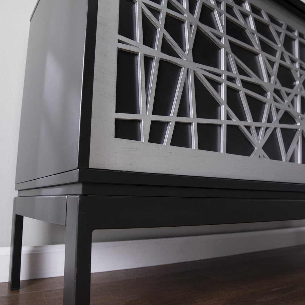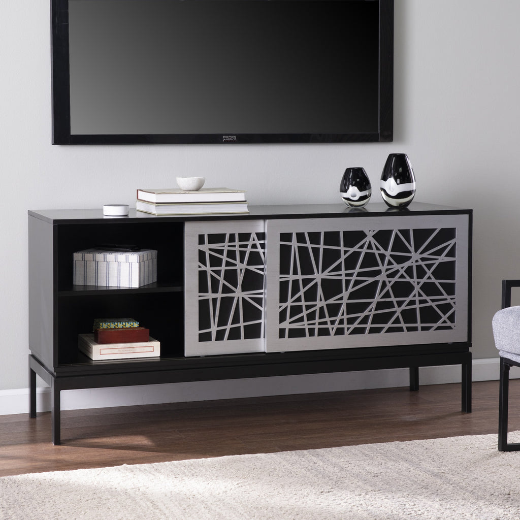 Keep Your Living Space Neat And Tidy With This Modern Media Console. Two Spacious Cabinets Organize Your Favorite Books Or Movie Collection, While The Wide Tabletop Holds Dcor Pieces Or Potted Plants. Bold, Geometric Patterns On The Sliding Doors Create A Sleek, Contemporary Feel, Adding A Pop Of Stylish Design To Your Home. Place This Storage Credenza In Your Dining Room To Host A Come-And-Go Buffet,Or Station Beneath Your Wall-Mounted Tv For Media Storage Right Where You Need It.