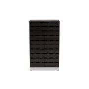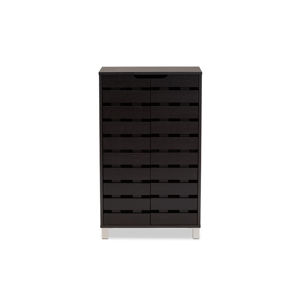 Organize Your Shoe Collection In Modern Style With The Stunning Ernest Shoe Cabinet. Made In Malaysia, The Ernest Is Comprised Of Sturdy Wood Showcasing A Rich Dark Brown Finish. Six Internal Shelves Provide Space To Store Up To 18 Pairs Of Shoes, Depending On Size. Requiring Assembly, The Cabinet Features Open Slatted Doors To Enable Air Circulation And Deter Odor Buildup. Grey Finished Feet Complete The Look. A Handy Piece Brimming With Contemporary Style, The Ernest Shoe Cabinet Is An Excellent Addition To Any Home.