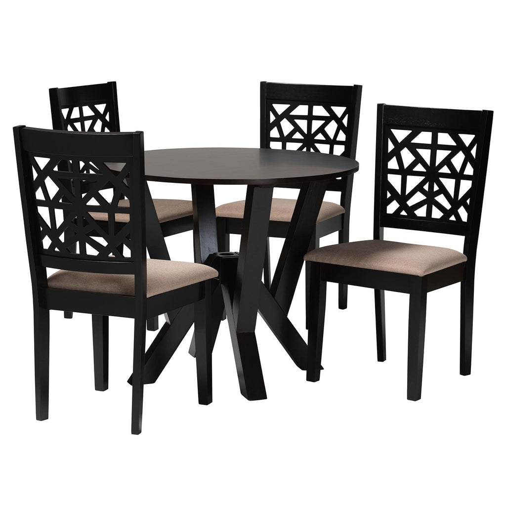 The Crisp Geometry And Cozy Design Of The Felice Dining Set Elevates Any Occasion. Made In Malaysia, This Modern Set Includes Four Chairs And One Table Crafted From Sturdy Wood. Each Seat Is Padded With Plush Foam And Upholstered In Soft Fabric While The Backs Of The Chairs Feature A Unique Cut-Out Design For A Captivating Display. The Felice Requires Assembly And Utilizes A Round Tabletop Supported By An Intersecting Base For A Chic, Sculptural Effect. Anchoring Your Arrangement With Contemporary Flair, The Felice Dining Set Is A Remarkable Arrangement.
