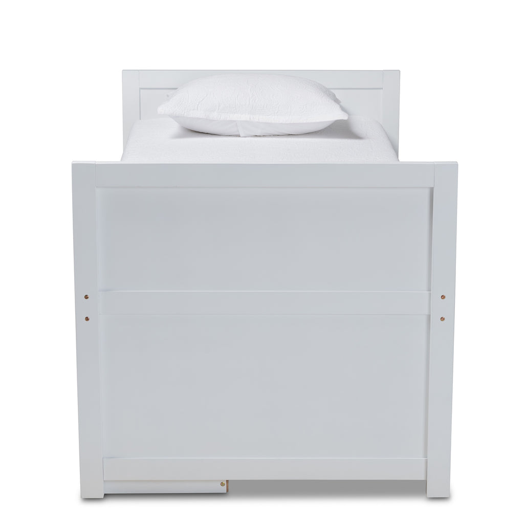 Functioning As A Bed, Dresser, And Desk In One, The Mirza Bed Takes Versatility To New Heights. Made In Malaysia, This Wooden Bed Features A Sleek White Finish That Brightens Any Space. Five Spacious Drawers Provide Ample Space To Store Clothes, While An Open Shelf Provides Room To Display Books. Designed With The Utmost Functionality In Mind, The Mirza Is Also Fitted With Two Pull-Out Panels That Can Be Used As Both A Desk And Shelf. Its Clean White Finish And Gold-Tone Metal Hardware Lends A Sleek Look, While Inset Detailing Conveys Modern Elegance. Requiring Assembly, The Mirza Bed Is The Quintessential Piece For Any Kids Room.