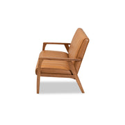 The Nikko Sofa Is A Stunning And Eye-Catching Piece Perfect For Adding Personality To Any Space. Made In Malaysia, The Nikko Is Constructed From Sturdy Wood Padded With Soft Foam And Upholstered In Smooth, Tan-Colored Faux Leather. The Angular Frame Showcases Warm Walnut Tones And Features Long Legs That Form Ergonomic Armrests. Requiring Assembly, Sleek Channel Tufting Provides Unique Visual Charm While Ensuring Plush Comfort That Lasts. With A Nod To Mid-Century Design, The Nikko Sofa Is An Ideal Accent Piece For The Modern Home.