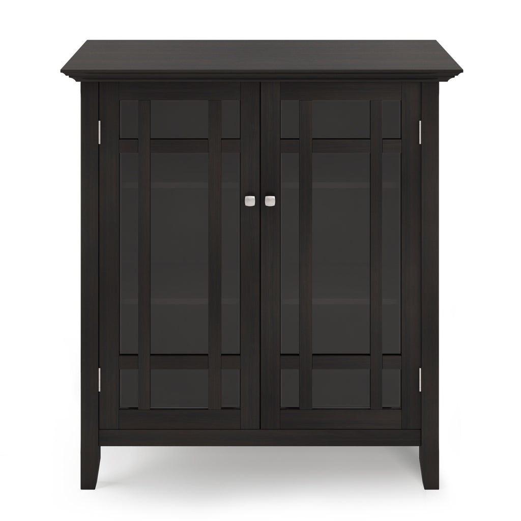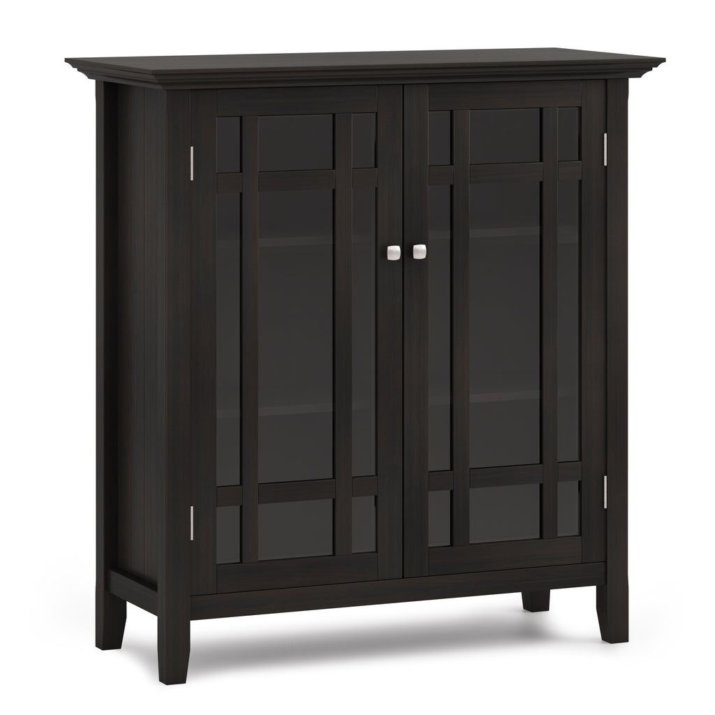The SIMPLIHOME Bedford Medium Storage Cabinet features a transitional style, blending traditional and contemporary design elements.