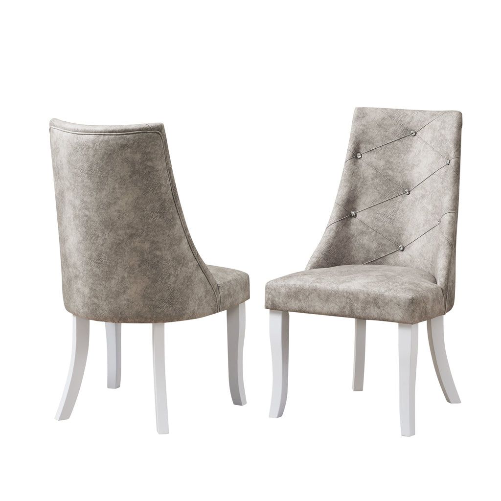 Benoit Crystal Tufted Upholstered Dining Side Chairs, Silver Fabric & White Wood (Set Of 2). Dine-In Luxurious Style With These Benoit Upholstered Dining Chairs. Featuring A Curved High Back, Plush Cushioned Seat, And Deeply Tufted Polyester Upholstery Studded With Crystals, These Dining Chairs Are Sure To Take Your Dining Experience To A Whole New Level. White Curved Solid Wood Legs Complement The Stunning Upholstery For A Sleek, Contemporary Design And Provide Sturdy Support For Years To Come.