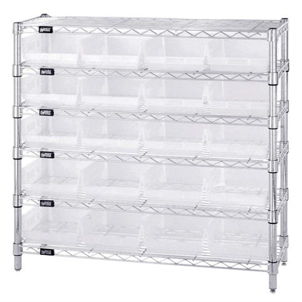 The Quantum Storage Systems Wr6-36-1236-107Cl Six-Tier Bin Shelving System Has Wire Shelves And Posts Made Of Chrome-Finished Steel To Support An 800 Lb. Per Shelf Capacity When Distributed Evenly Across The Shelf, 20 Translucent Qsb107Cl Plastic Pull-Out Bins, And Is Suitable For Sorting, Storing, And Dispensing Items. The Bin Shelving Systems Open Wire Design Offers Visibility Of Contents, Permits Air Circulation In The Work Environment, And Helps Resist Dust Build-Up. The Wire Shelves Have All Welded Steel Construction And Are Reinforced With Wire Trusses For Strength And They Adjust In 1 Increments To Accommodate Items Of Varying Heights. The Posts Are Grooved At 1 Intervals To Help Guide Installation Of The Shelves At Desired Heights, And Come With Leg Levelers For Use On Uneven Surfaces. Split Sleeves On The Posts Hold And Support The Shelves. The Pull-Out Bins Are Made Of Polypropylene For Strength And Resistance To Moisture And Corrosion. The Bins Have An Open Hopper Front For Visibility Of And Access To Items In The Bin, A Rear Hang-Lock For Tilt-Out Access To Items In The Bin, And Can Be Partitioned With Dividers (Sold Separately) To Hold Items Of Different Sizes. Molded Front Label Holders On The Bins Facilitate The Identification Of Bin Contents.The Assembled Bin Shelving System Measures 36 X 36 X 12 Inches (H X W X D). (H Is Height, The Vertical Distance From Lowest To Highest Point; W Is Width, The Horizontal Distance From Left To Right; D Is Depth, The Horizontal Distance From Front To Back.) The Outside Of The Bins Measure 4 X 8-3/8 X 11-5/8 Inches (H X W X D), And The Inside Of The Bins Measure 4 X 7-1/8 X 10-1/4 Inches (H X W X D). This Bin Shelving System Requires Assembly And Comes With Instructions; No Tools Are Needed.Quantum Storage Systems Manufactures Storage Bins And Systems, And Steel And Wire Shelving. The Company Is Headquartered In Miami, Fl. Whats In The Box? (6) Wire Shelf, Chrome Finish, 36 X 12 (W X D) (4) Post, Chrome Finish, 36 (H) (20) Qsb107Cl Bin, Translucent Plastic, 4 X 8-3/8 X 11-5/8 (H X W X D) (24) Split Sleeves Assembly Instructions