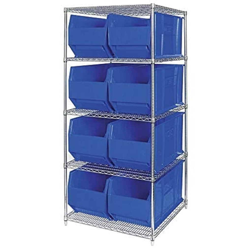 The Quantum Storage Systems Wr5-993Bl Five-Tier Bin Shelving System Has Wire Shelves And Posts Made Of Chrome-Finished Steel To Support An 800 Lb. Per Shelf Capacity When Distributed Evenly Across The Shelf, Eight Blue Qus993 Plastic Pull-Out Bins, And Is Suitable For Sorting, Storing, And Dispensing Items. The Bin Shelving Systems Open Wire Design Offers Visibility Of Contents, Permits Air Circulation In The Work Environment, And Helps Resist Dust Build-Up. The Wire Shelves Have All Welded Steel Construction And Are Reinforced With Wire Trusses For Strength, And They Adjust In 1 Increments To Accommodate Items Of Varying Heights. The Posts Are Grooved At 1 Intervals To Help Guide Installation Of The Shelves At Desired Heights, And Come With Leg Levelers For Use On Uneven Surfaces. Split Sleeves On The Posts Hold And Support The Shelves. The Plastic Pull-Out Bins Have An Open Hopper Front For Visibility Of And Access To Items In The Bins, And Can Be Partitioned With Dividers (Sold Separately) To Hold Items Of Different Sizes. The Open Hopper Front On Each Bin Is Slotted For A Clear Plastic Window (Sold Separately) To Increase The Amount Of Items The Bin Can Hold While Maintaining Visibility Of The Contents. The Bins Are Stackable And Have A Stacking Ledge With An Anti-Slide Lock To Help Keep Stacked Bins From Shifting Forward. They Withstand Temperatures Up To 250 Degrees F, And Can Be Sterilized Using Most Autoclave Devices.The Assembled Bin Shelving System Measures 86 X 36 X 36 Inches (H X W X D). (H Is Height, The Vertical Distance From Lowest To Highest Point; W Is Width, The Horizontal Distance From Left To Right; D Is Depth, The Horizontal Distance From Front To Back.) The Outside Of The Bins Measure 17-1/2 X 16-1/2 X 35-7/8 Inches (H X W X D), And The Inside Of The Bins Measure 17-1/4 X 14 X 33-1/8 Inches (H X W X D). This Bin Shelving System Requires Assembly And Comes With Instructions; No Tools Are Needed.Quantum Storage Systems Manufactures Storage Bins And Systems, And Steel And Wire Shelving. The Company Is Headquartered In Miami, Fl. Whats In The Box? (5) Wire Shelf, Chrome Finish, 36 X 36 (W X D) (4) Post, Chrome Finish, 86 (H) (8) Qus993 Bin, Blue Plastic, 17-1/2 X 16-1/2 X 35-7/8 (H X W X D) (20) Split Sleeves Assembly Instructions