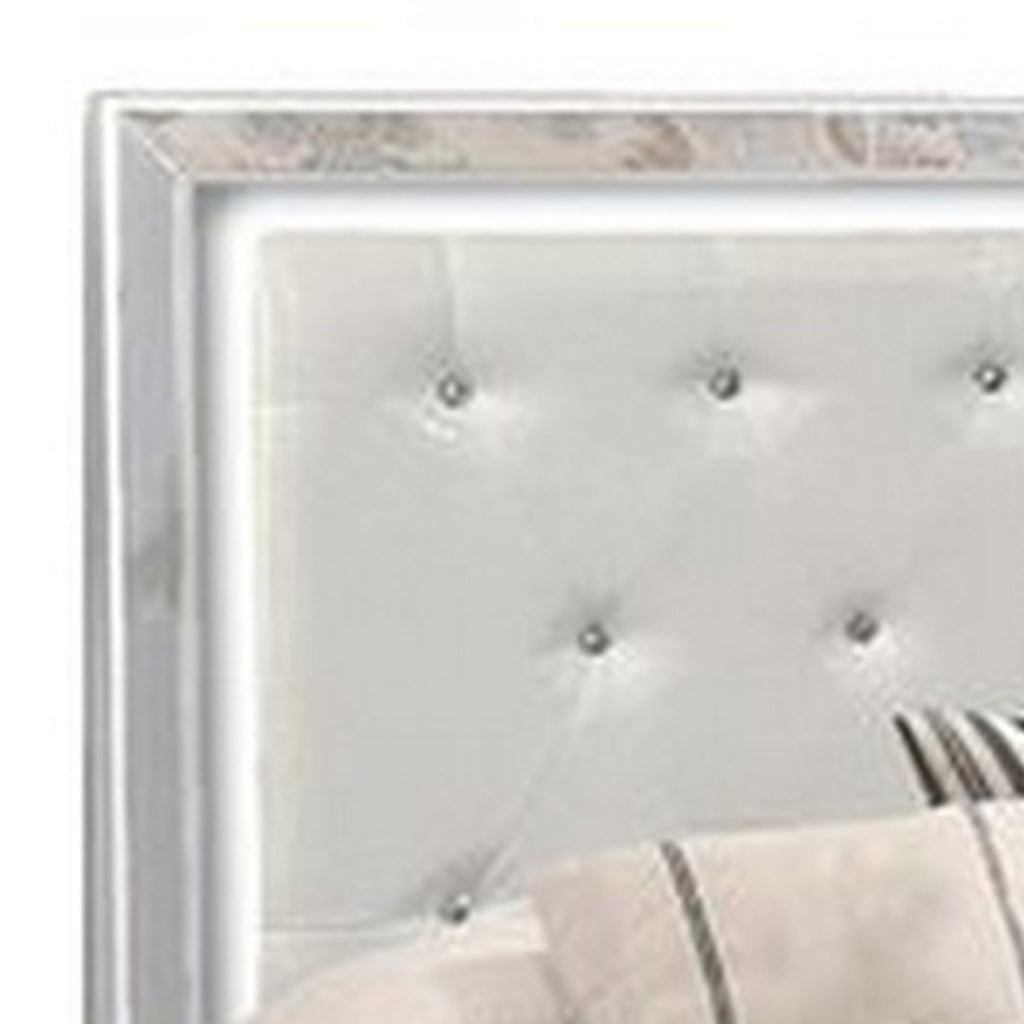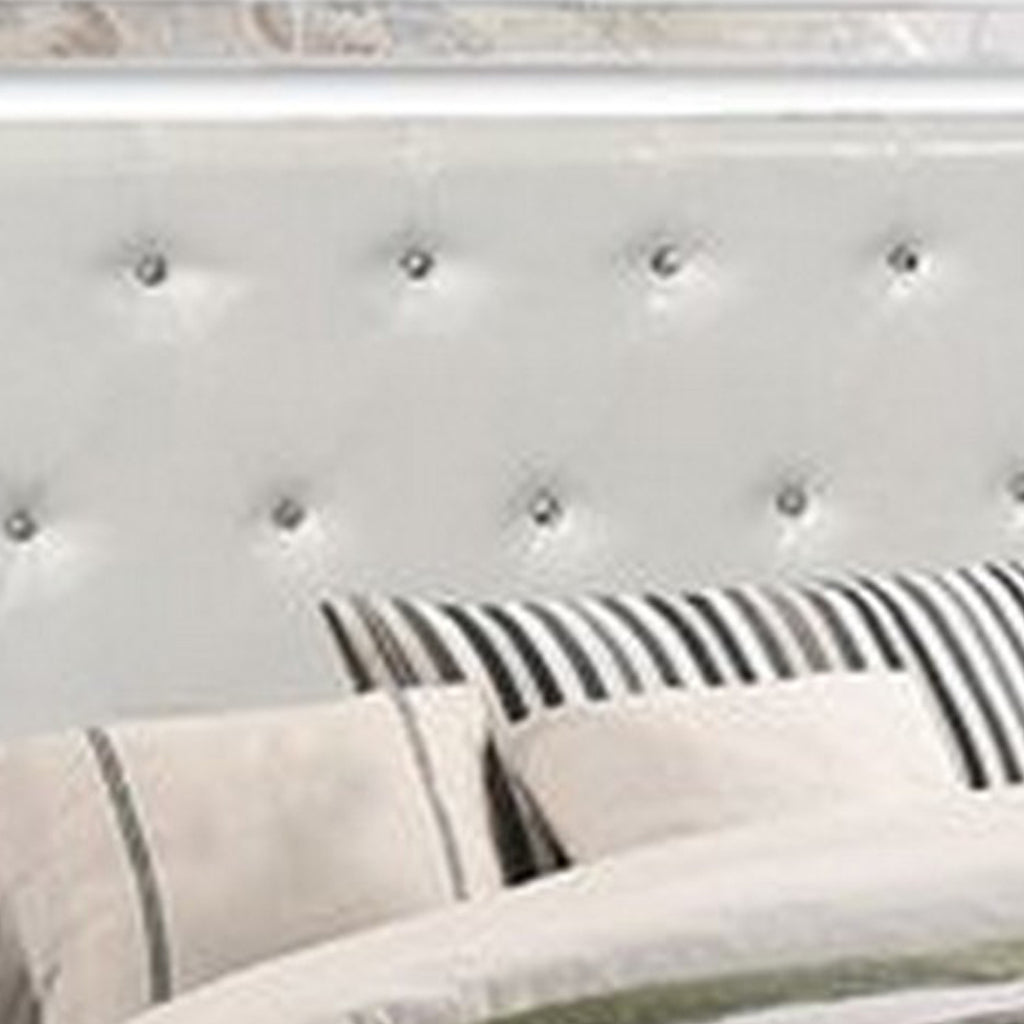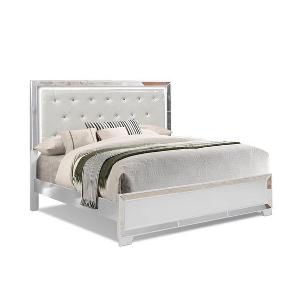 The Benjara Eli bed features a modern design with a crystal tufted headboard, sleek mirror trimming, and a contemporary white finish.